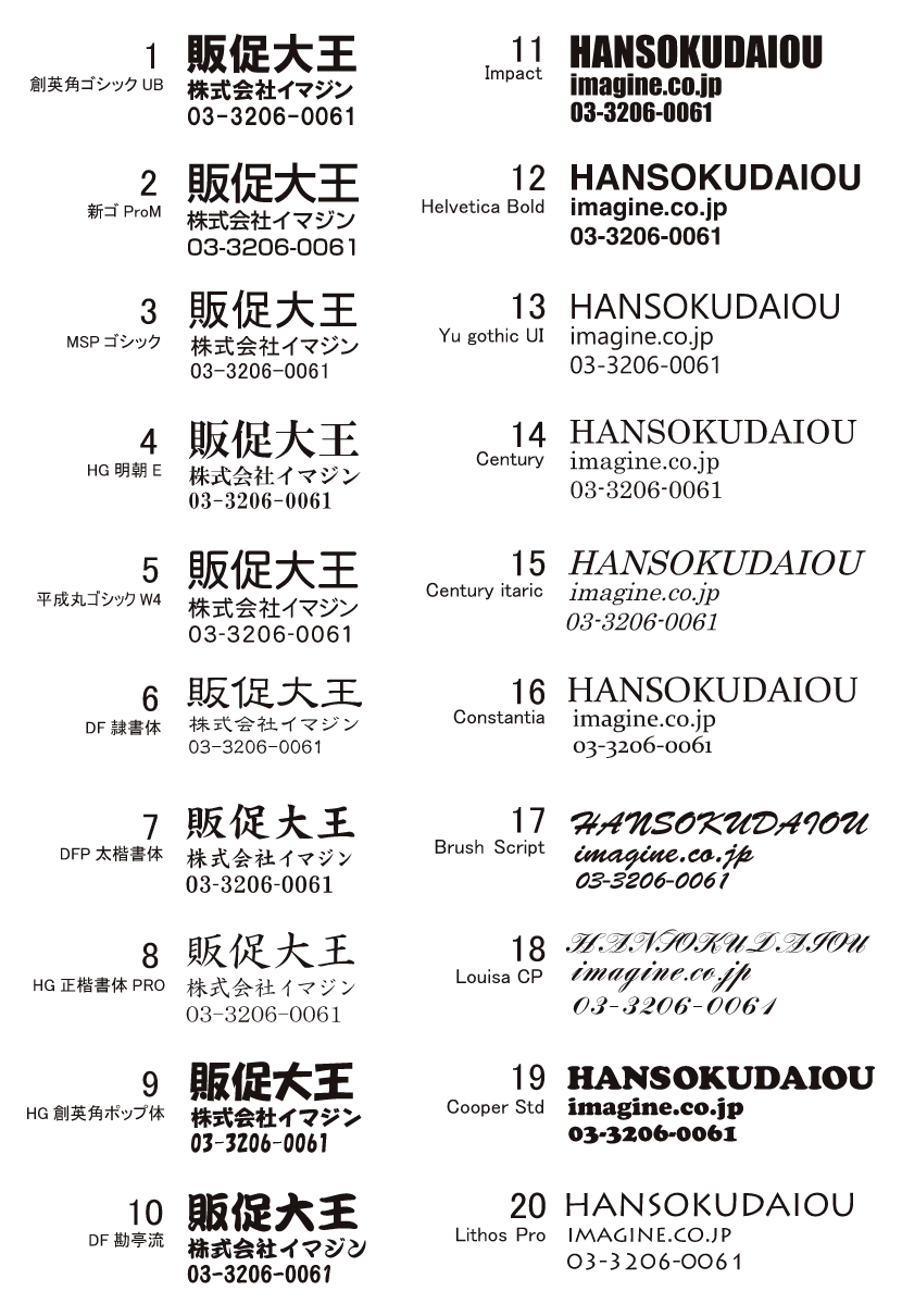 通常多く使われている下記フォント書体をご用意しておりますので「お見積・注文フォーム」の「名入れ書体」からご指定下さい。