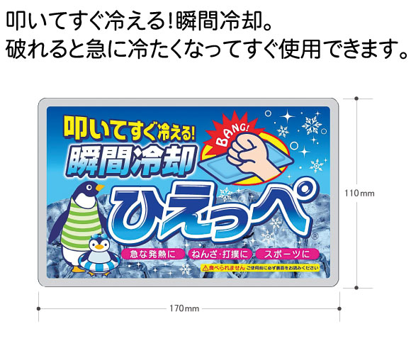 瞬間冷却パック ひえっぺは叩いてすぐ冷える!瞬間冷却。平らな所に置いて強くたたき、中の水袋を破ってください。破れると急に冷たくなってすぐ使用できます。保冷時間はご使用状況により異なりますが、室温25℃で約20分です。