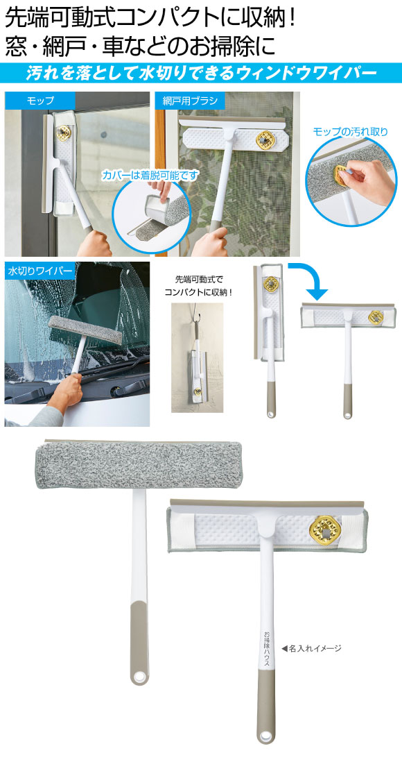 収納便利なマルチウィンドウワイパーは窓や網戸、車体掃除に便利な3WAYウィンドウワイパーです。省スペース設計で収納も簡単です。モップ・網戸用ブラシ・水切りワイパーの3つの機能を1本で実現。モップカバーは着脱可能で、モップの汚れ取り用ツールも付属しています。小回りが利くハンディサイズで、先端が可動式でT字からI字に変えてコンパクトに収納可能です。