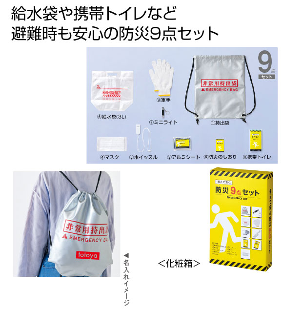 備えて安心 防災9点セットは給水袋や携帯トイレなど、避難時にあると安心のセット。A4サイズが入るスペースに置けるパッケージ入り。防災アイテムとして特に需要の高い給水袋(3L)と携帯トイレを含む充実の9点セットです。本棚に常備しておけば、いざという時あわてずに持ち出せます。持出袋には名入れも可能。企業の備品としても是非ご活用ください。
