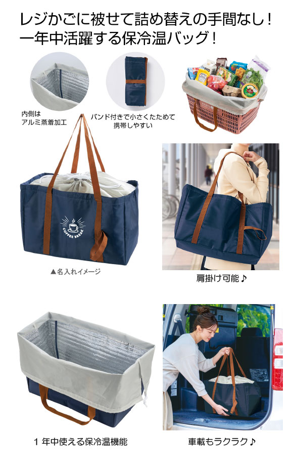 レジかごフィット!大きな保冷温バッグはレジカゴからの詰め替えの手間なし!一年中活躍する保冷温バッグ。小さくたためるバンド付き。たくさん買っても安心の巾着仕様、肩にも掛けられる長めのハンドル、携帯しやすい折りたたみ式 とうれしいポイントがたくさん!普段のお買い物の強力なパートナーになってくれそうです。