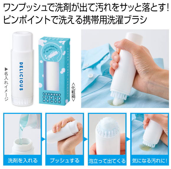 ポータブル洗濯ブラシは出先で汚れてしまってももうあせらない!ピンポイントで洗える携帯用洗濯ブラシ。本体の中に液体洗剤を入れてプッシュすると、ブラシ部分から洗剤が泡立って出てくるのでそのまま汚れてしまった部分をこすり洗い!旅行や出張の際にあると心強い1本です。小さいお子さまがいるご家庭向けにも。