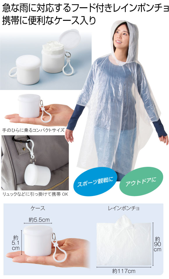 - 本体サイズ:ケース/約5.5×5.9×5.1cm、レインポンチョ/約117×90cm