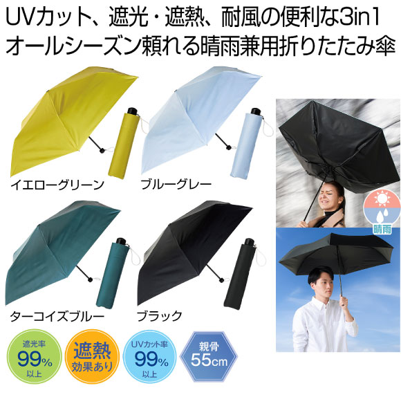 晴雨兼用 3in1折りたたみ傘は UVカット/耐風/遮光・遮熱の3つの機能を備えたオールシーズン対応の折りたたみ傘。遮光率・遮熱率ともに99%以上!遮熱効果も認められた、実用性抜群の晴雨兼用傘です。男女問わずお使いいただける4色のカラーバリエーションでご用意しました。名入れをして記念品としても喜ばれます。