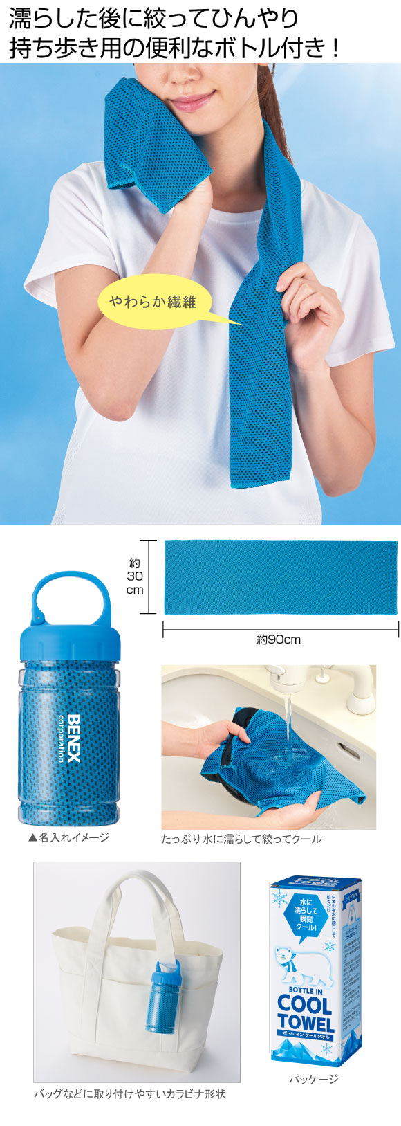 ボトルインクールタオルは水に濡らして絞ってクール!使用後の持ち歩きに便利なボトルケース入り。ボトルケースの蓋は、バッグなどに取り付けやすいカラビナタイプの形状です。夏の販売促進として名入れしてノベルティ、販促品用に配布すれば企業やお店のイメージアップや売り上げにつながります。
