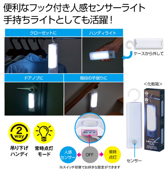 フック付き人感センサーライトはクローゼットやドアノブに吊り下げできるフック付きの人感センサーライトです。部屋やトイレのドアノブ、階段の手すりなどに簡単に設置可能。スイッチで人感センサー、OFF、常時点灯の切り替えができ、本体からケースを外せばハンディライトとしても利用可能で、夜中の移動や急な停電時に安心して使えます。名入れ対応で、防災イベントのノベルティや周年記念品などに最適です。