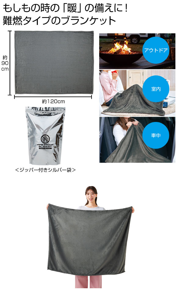 備えて安心 難燃ブランケットはキャンプファイヤーや焚き火もこれで安心。特殊な加工を施した難燃(燃え広がりにくい)ブランケット。火の粉を気にせず焚き火にあたれます。もちろん、アウトドアシーンだけでなく被災時の備えとしても。防災意識を高めるシルバーのスタイリッシュなジッパー袋入り。