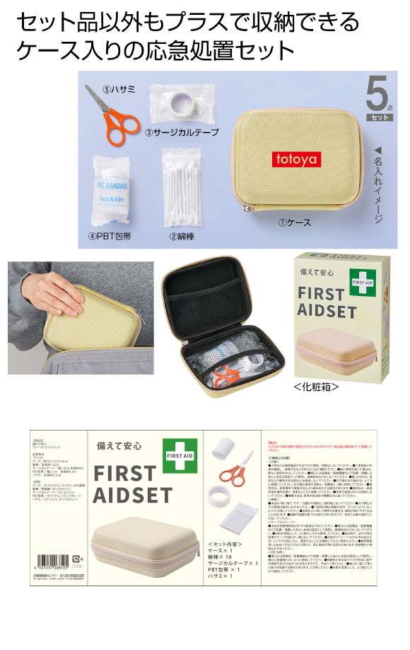 備えて安心 ファーストエイドセットはセット品以外にも独自にプラスして備えておけるケース入りの応急処置セット。ケースに名入れをし、企業の備品としてもご活用いただけます。