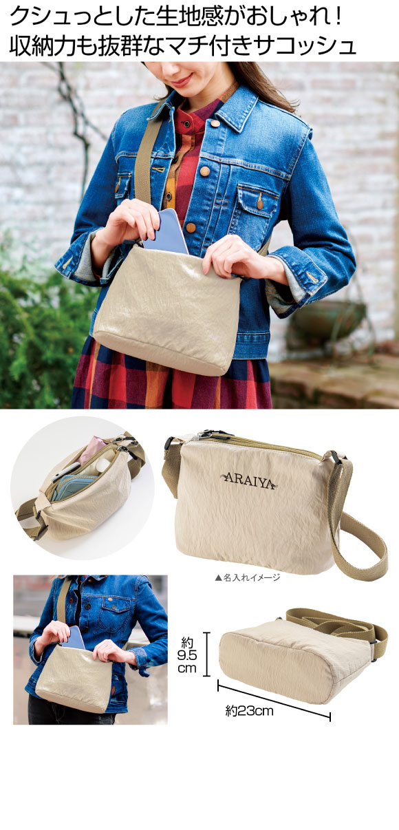 2ポケットマチ付きサコッシュはクシュッとした生地感がおしゃれなショルダーバッグです。ポケットが2つ付いた便利なマチ付きサコッシュでバッグの中でモノが迷子になりにくく使い勝手も抜群。ナチュラルなベーシックカラーで日常使いがしやすくアクティブな日にピッタリなショルダータイプです。