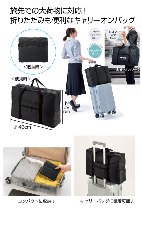 markable 折りたたみキャリーオンバッグは旅行や帰省、出張に!スーツケースのハンドルに装着できる、折りたたみ式のボストンバッグ。持つ人を選ばず名入れも映えるオールブラックのシンプルデザイン。高いコストパフォーマンスにも注目です。