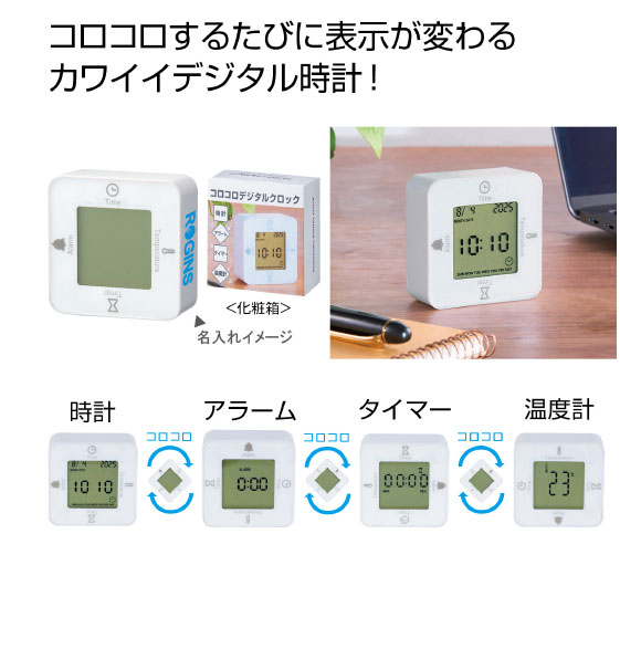コロコロデジタルクロックは時計・アラーム・温度計・タイマーの4つの機能が付いた4WAYの時計。コロコロ回転させて4つの機能楽しく使いこなせ!