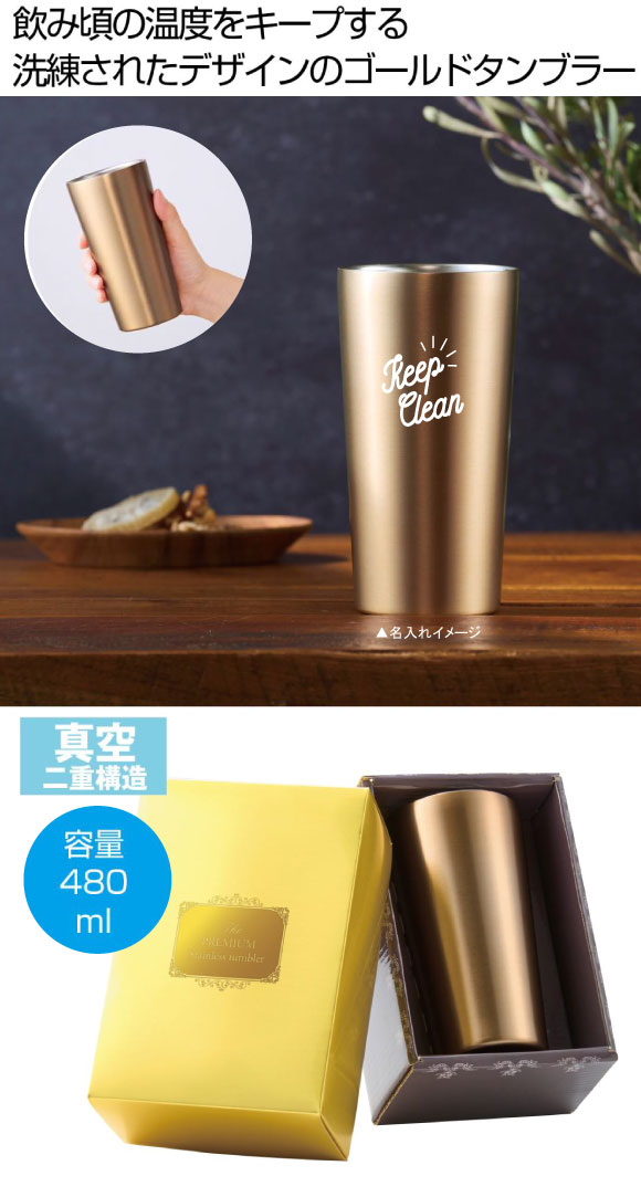 プレミアム真空ステンレスペアタンブラー480mlは ゴールドパッケージの中には格調高いゴールドのタンブラーが収納されています。ドリンクの飲み頃の温度をキープします。大人が愉しむ上質な時間に寄り添うステンレスタンブラー。是非レーザー名入れを施してご活用ください。 贈答品に最適な身蓋式の化粧箱がその価値をさらに高めます。