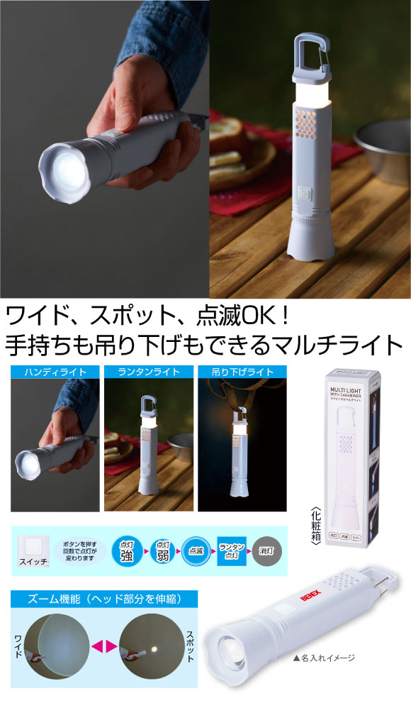 カラビナ付きマルチライトはワイド/スポット/点滅OK!手持ちも吊り下げもできるスリムなマルチライト。本体を伸ばせばランタンとして使用可能。ヘッド部分を伸縮させればスポットからワイドまで点灯できます。スイッチを押すと<強→弱→点滅→ランタン→消灯>の順に切り替わります。