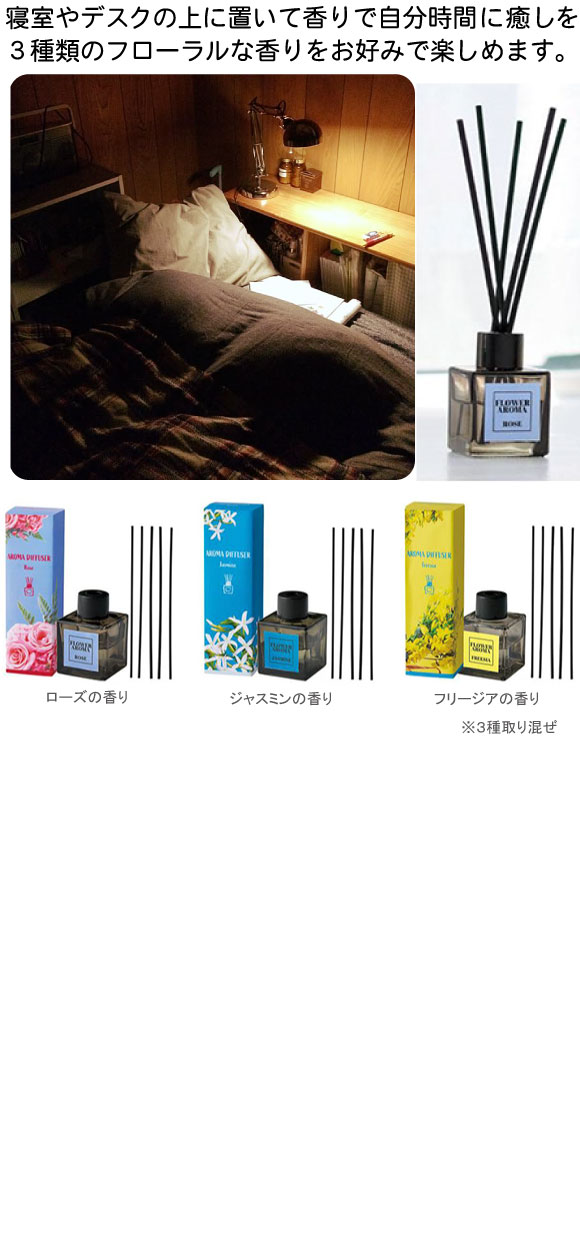 フラワーアロマディフューザーは玄関やリビング、書斎、寝室に飾って自宅を癒しの空間に。ローズ/ジャスミン/フリージアの3つの香り。スタイリッシュなアロマディフューザーで暮らしにパッと華やぎを。春先や新生活シーズンのノベルティにおすすめです。香りに合わせた3種類のパッケージでお届けします。