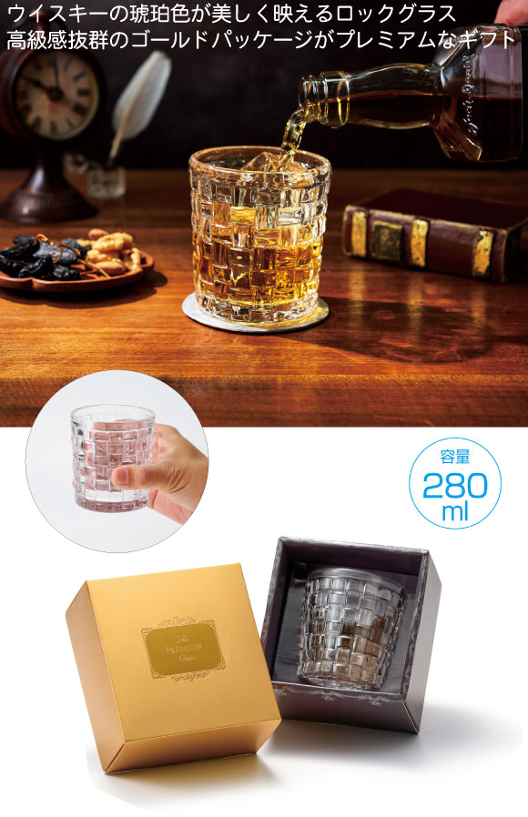 プレミアムグラス 280mlはほどよい重厚感とホールド感。大人のためのロックグラスをプレミアムなゴールドボックスに納めました。手にしっくりなじむサイズ感で、ウイスキーや焼酎の時間を上質に演出します。落ち着いたデザインと化粧箱入りで、企業ノベルティや記念品、大人向けのギフトに最適な一品です。来場者プレゼントや周年記念など様々な企画に活用できます。