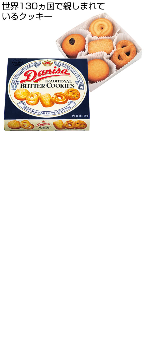 ダニサバタークッキー90g(15枚)は世界130ヵ国で親しまれているクッキー。5種類のクッキーがアソートされた箱入りのコンパクトサイズの商品です。デンマーク王宮伝統レシピを元に作られた昔から変わらない美味しさ。バター含有率25%のサクサク食感。