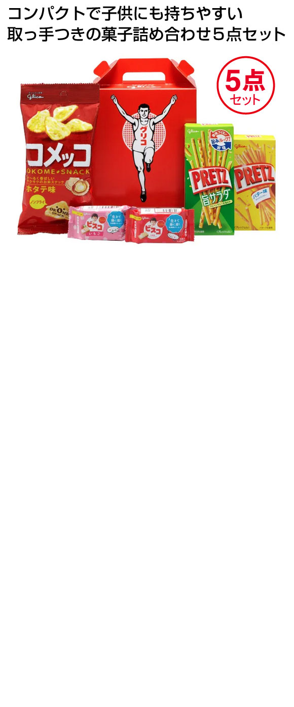 セレクション・ザ・グリコ(手提げ) はみんな大好き、プリッツやビスコなどグリコの人気のお菓子5種類を詰め合わせた豪華でお得なパックです。ボール紙製の化粧箱にお菓子を5点封入しています。上部に取っ手があり、コンパクトなためお子様でも持ちやすい菓子ボックスです。