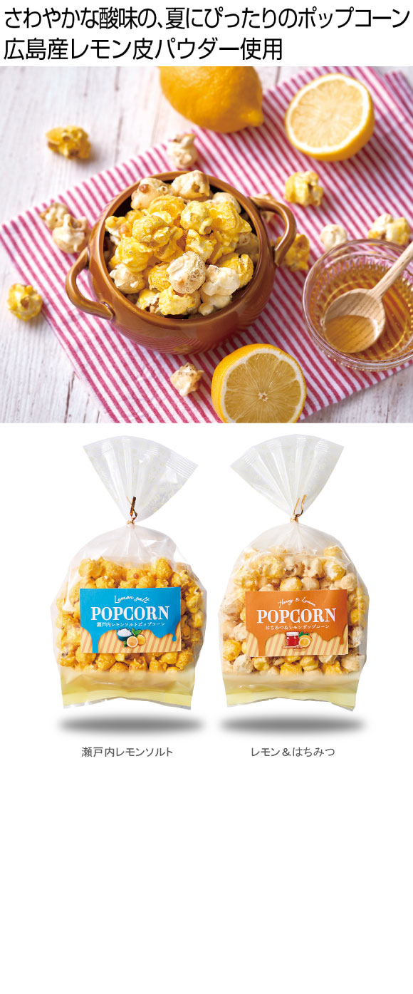 Fudge Concierge ポップコーンはさわやかな酸味が夏のリラックスタイムにぴったり。瀬戸内レモンソルト/レモン&はちみつの2種展開です。さわやかなレモンの風味があとひく美味しさ!パウダーにした広島産レモンの皮を使用しています。