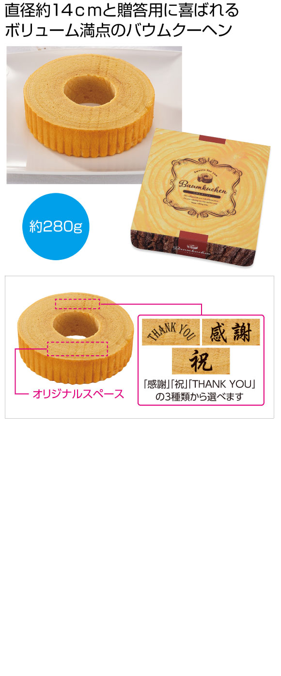 オリジナル名入れバウムクーヘンはオリジナルデザインのできる、直径約14cmとボリューム満点の、贈答品に喜ばれるバウムクーヘンです。直径約14cmとボリューム満点の、贈答品に喜ばれるバウムクーヘンです。バウムクーヘン特有の生地模様を木の年輪に見立て、高級感をもたせたパッケージデザインにも注目です。(名入れ代は別途見積り)