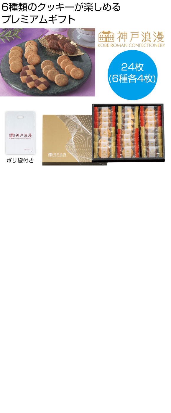 神戸浪漫 プレミアムクッキーギフトは6種のクッキーを計24枚セットにした、プレミアムなギフトです。高級感のある金調のパッケージが贈答品にもぴったりです。お持ち帰り用の専用ポリ袋をセットにしております。