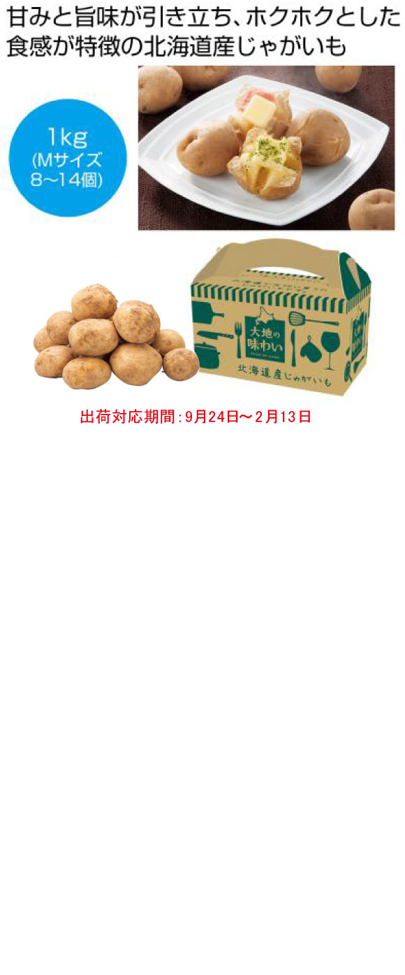 - 備考:セット内容/北海道産じゃがいも(男爵)約1kg(Mサイズ8~14個) 備考※生鮮食品のため、天候などにより出荷対応期間が変更になることがございます。 ※生鮮食品のため、高温多湿・直射日光を避けて冷暗所にて保管してください。 ※収穫状況により、サイズ・個数が異なる場合がございます。 ※生鮮品のため、賞味期間はお届け後の品質保持期間の目安を表記しています。 賞味期間/目安7日間(常温) 出荷対応開始日/出荷対応期間:9月24日(水)~2月13日(金)