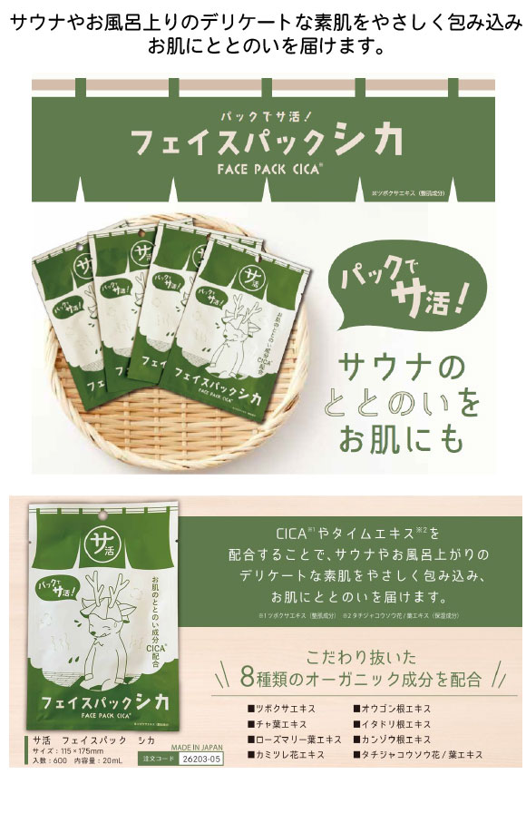 サ活 フェイスパック シカはCICA※1やタイムエキス※2を配合することで、サウナやお風呂上りのデリケートな素肌をやさしく包み込み、お肌にととのいを届けるフェイスパックです。サウナ店やサウナ付きホテルをターゲットとして、アメニティや売店の販売用としてもご活用いただけます。※1ツボクサエキス(整肌成分) ※2タチジャコウソウ花/葉エキス(保湿成分)