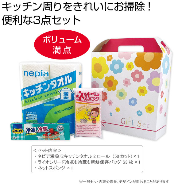 ボリューム満点キッチンギフト3点セットは 定番の日用品ギフトはどなたにも喜ばれます。キッチン周りで使用できる日用品のギフトセット!もらったお客様に喜んでいただけるボリューム満点のセットです!