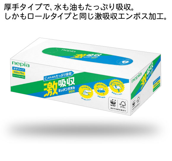 ネピア 激吸収キッチンタオルBOX 75Wは厚手タイプで、水も油もたっぷり吸収します。しかもロールタイプと同じ激吸収エンボス加工。・FSC認証紙を採用。