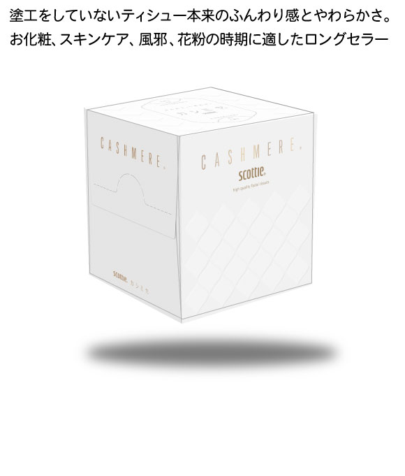 スコッティ カシミヤキューブ80Wは塗工をしていないティシュー本来のふんわり感とやわらかさ。お化粧、スキンケア、風邪、花粉の時期に適した、ロングセラープレミアムティシューピュアパルプ100%。狭い所でも使いやすいキューブタイプです。