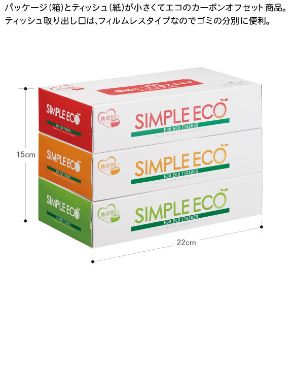 シンプルエコBOXティッシュ100W 3個組はパッケージが小さくてECO・ティッシュが小さくてECO・取り出し口がフィルムレスでECO・カーボンオフセット商品でとってもECOなのでゴミの分別に地球にやさしいBOXティッシュです。