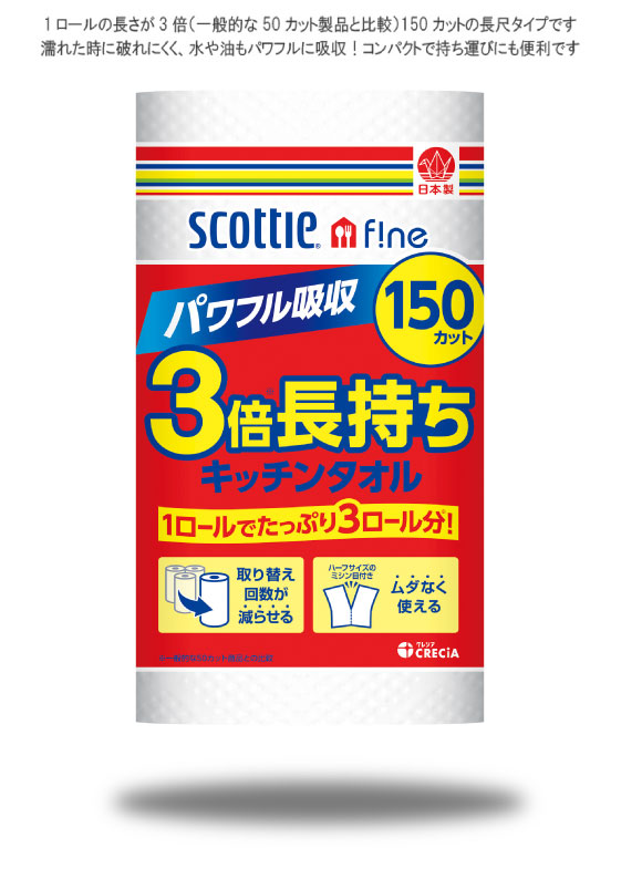 スコッティファイン3倍長持ちキッチンタオル(150カット)は150カットの長巻タイプ。1ロールでコンパクトに持ち運べて収納スペースも軽減。ピュアパルプ100%で衛生的。半分サイズに切れるミシン目つきで、使用目的に合わせて調整ができ、便利なキッチンペーパーです。