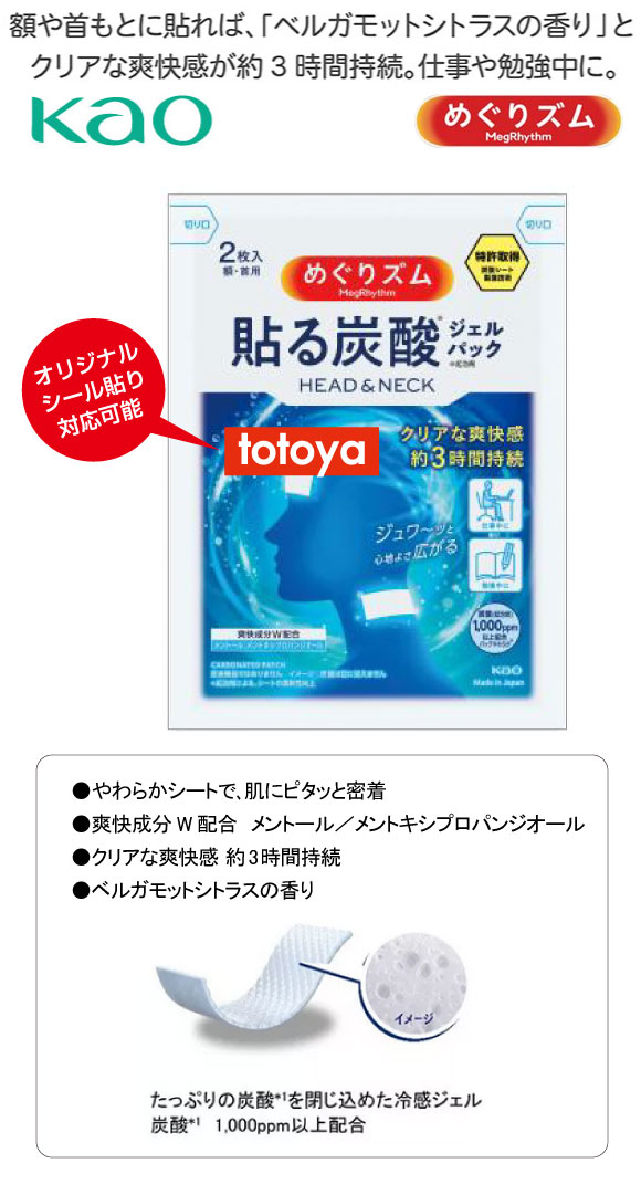 花王めぐりズム 貼る炭酸ジェルパック HEAD&NECK 2枚入は日本で唯一の炭酸配合ジェルパックです。やわらかシートで、額や首もとに貼れ肌にピタッと密着。ベルガモットシトラスの香りと爽快成分W配合(メントール/メントキシプロパンジオール)でクリアな爽快感が約3時間持続します。1色~フルカラーまでオリジナル印刷でのシール貼りが可能です。