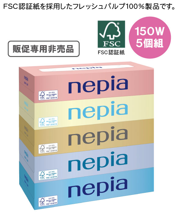 ネピア ティシュ150W 5個組は地球資源の保護に貢献するFSC認証紙を採用したフレッシュパルプ100%製品です。 汎用性の高いティシュです。 販促専用非売品です。来場粗品にピッタリなもらって嬉しいかさばる商品です。