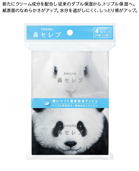 ネピア鼻セレブポケットティシュ12W4個組は新たにクリーム成分を配合。 従来のダブル保湿から、トリプル保湿へ。 紙表面のなめらかさがアップしました。 水分を逃がしにくく、しっとり感がアップ。 新しい鼻セレブは、1.3倍(従来品)の保水力です。ティッシュやばらまき、粗品、家庭用品の販売促進としてノベルティ、販促品用に配布すれば企業やお店のイメージアップや売り上げにつながります。