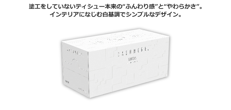 スコッティカシミヤ 220Wは塗工をしていないふんわり感とやわらかさ。こだわりの製造方法でやわらかさと丈夫さを両立。厳選した高品質のパルプのみ使用したティシューです。カシミアを象徴する白いパッケージとエンボス加工のパッケージ。