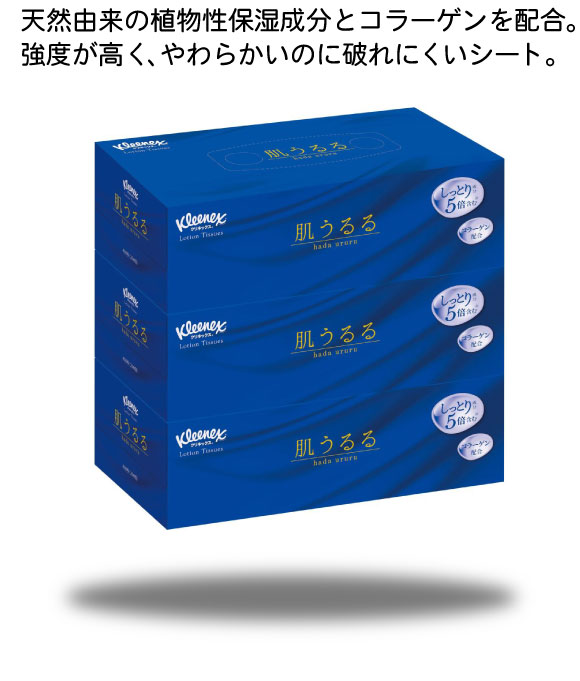 クリネックス ティシューローション肌うるる204W 3個組は天然由来の植物性保湿成分とコラーゲンを配合。 強度が高く、やわらかいのに破れにくいシート。 厳選したパルプを使用し、鼻にやさしいしっとりなめらかな使いごごち。 森林認証紙(FSC)を使用。 ピュアパルプ100%。
