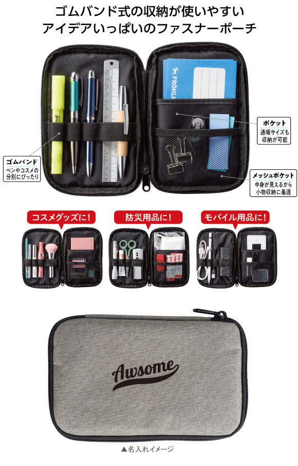 すっきり収納マルチポーチはゴムバンド式の収納が使いやすい、コスメや文具、モバイルグッズの整理に役立つアイデアいっぱいのファスナーポーチ。