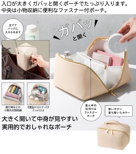 ムーア オープンポーチは入口が大きくガバッと開くポーチ。中央は小物収納に便利なファスナー付ポーチ。たっぷり入って中身を確認しやすい仕様です。