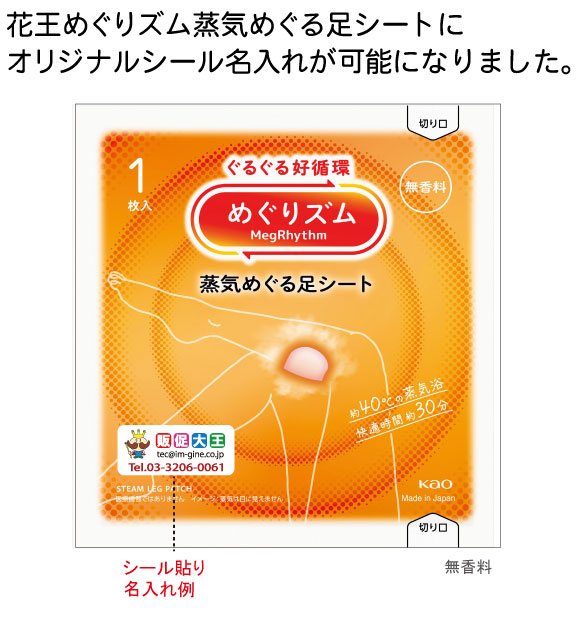 花王めぐりズム 蒸気めぐる足シート【無香料】 シール名入れ専用は288個単位でシール印刷貼りが可能。座り仕事をした後に、お休み前に、電車や車などの移動の後に働き続けた足をほぐします。あったか蒸気で気分ほぐゆる約40℃の蒸気浴が約30分間続く足用シートです。やわらかくフィットし、はがれにくい薄型シート採用しました。