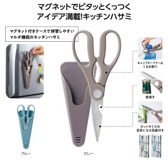 収納ケース付 4in1キッチンハサミはハサミ、キッチンオープナー、栓抜き、メモリ付きの4通りの機能を持ったキッチンハサミ。背面にマグネットが付いた収納ケース付きも便利。収納時に一体となる洗練されたデザイン性が魅力。