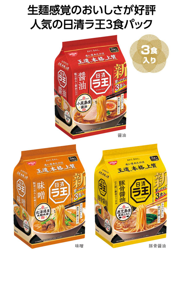 日清ラ王3食パックは生麺感覚のおいしさが好評。食べ応えのある太めの「もっちもち麺」の美味しさを一層引き立たせます。人気の日清ラ王次の3食パック。味噌、醤油、豚骨醤油の取り混ぜ可能です。