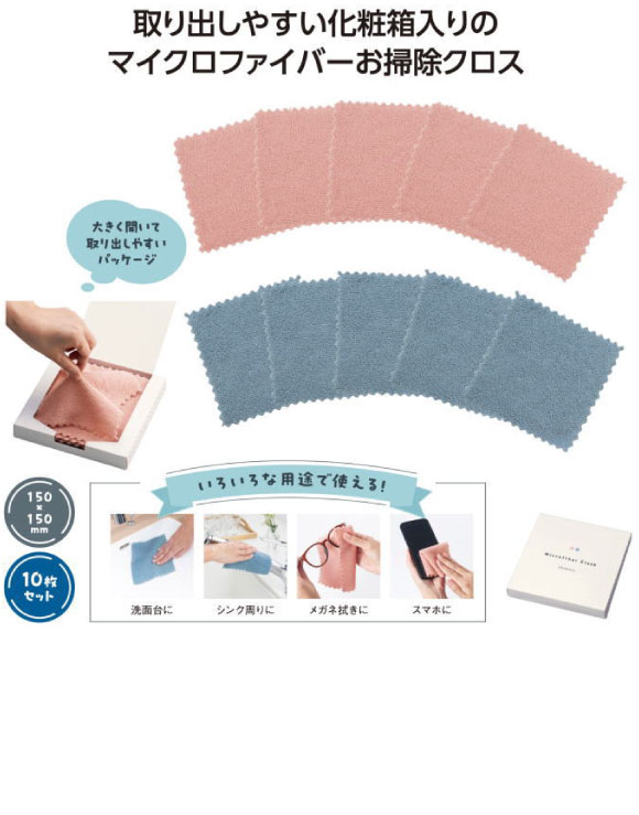 サッと使えるお掃除クロス10枚組はマイクロファイバークロス10枚セット。サッと使える150×150mmのミニサイズ。クロスが取り出しやすく、保管に便利な化粧箱入。