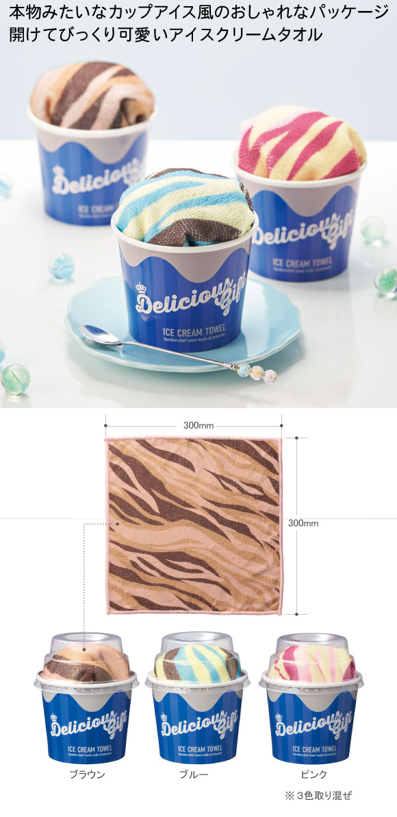 デリシャスギフト アイスクリームタオルは本物みたいなカップアイス風のおしゃれなパッケージに入ったもらって楽しいアイスクリームタオルです。並べてディスプレイしても映える商品です。タオルは大きめサイズでプチギフトに便利。夏のノベルティとして来場粗品などに喜ばれます。