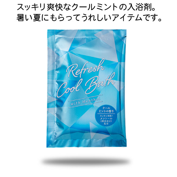 リフレッシュクールバスはスッキリ爽快なメンソール入りクールミントの入浴剤。暑い夏にもらってうれしいアイテムです。低単価なのでイベントでの配布にぴったり。 販売促進として配布すれば注目されて企業やお店のイメージアップや売り上げにつながります。
