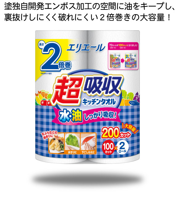 エリエール超吸収キッチンタオル2ロール(100カット)は独自開発エンボス加工の空間に油をキープし、裏抜けしにくく水をぐんぐん吸うのに破れない。2倍巻きの大容量のキッチンペーパーです。