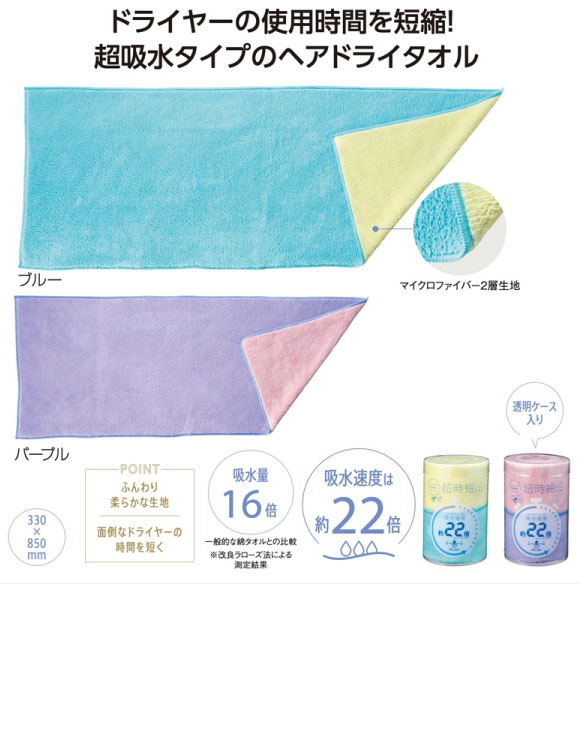 超時短ヘアドライタオルは吸水力の高いヘアドライ用のタオル。面倒なドライヤーの時間を短くしてくれます。ふんわり柔らかく触り心地のよい生地です。