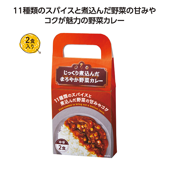 じっくり煮込んだまろやか野菜カレー2食入は11種のスパイスとじっくり煮込んだ野菜の甘みやコクが絶妙に絡み合ったまろやかな味。本格派の中辛レトルトカレー2食入りです。