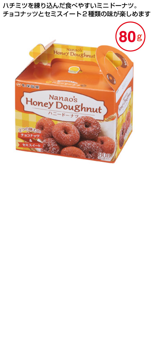 2つの味のハニードーナツ80g はハチミツを練り込んだ食べやすいミニドーナツ。チョコナッツとセミスイート2種類の味が楽しめる手提げボックス入りの商品です。