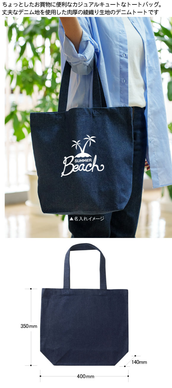 デニムトートはカジュアルでキュートなサイズ感が魅力のサイズ違いのデニムトート。しっかりとした生地感で耐久性があり、通勤・通学やお買い物、サブバッグとして幅広く活躍。使い込むほどに風合いが増す、丈夫で親しみやすい一品です。 ノベルティ、販促品として本体にロゴなどの名入れをすればより一層宣伝効果があります。
