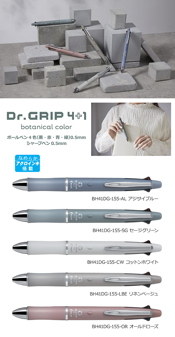 パイロット ドクターグリップ4+1 ボタニカルカラー (4色ボール0.5mm+シャープ)は日々仕事に努める大人に向けて、忙しい日常の中でも穏やかな気持ちでいられるように。仕事で使う筆記具に、マット塗装で上質に自然にあるような優しい色合いを採用しました。0.5mm(極細)のボールペンと0.5mmのシャープペンシルの機構を搭載したモデルとなります。水性に近いスムーズな書き心地と、ムラのない濃い筆跡が特色の「アクロインキ」採用。